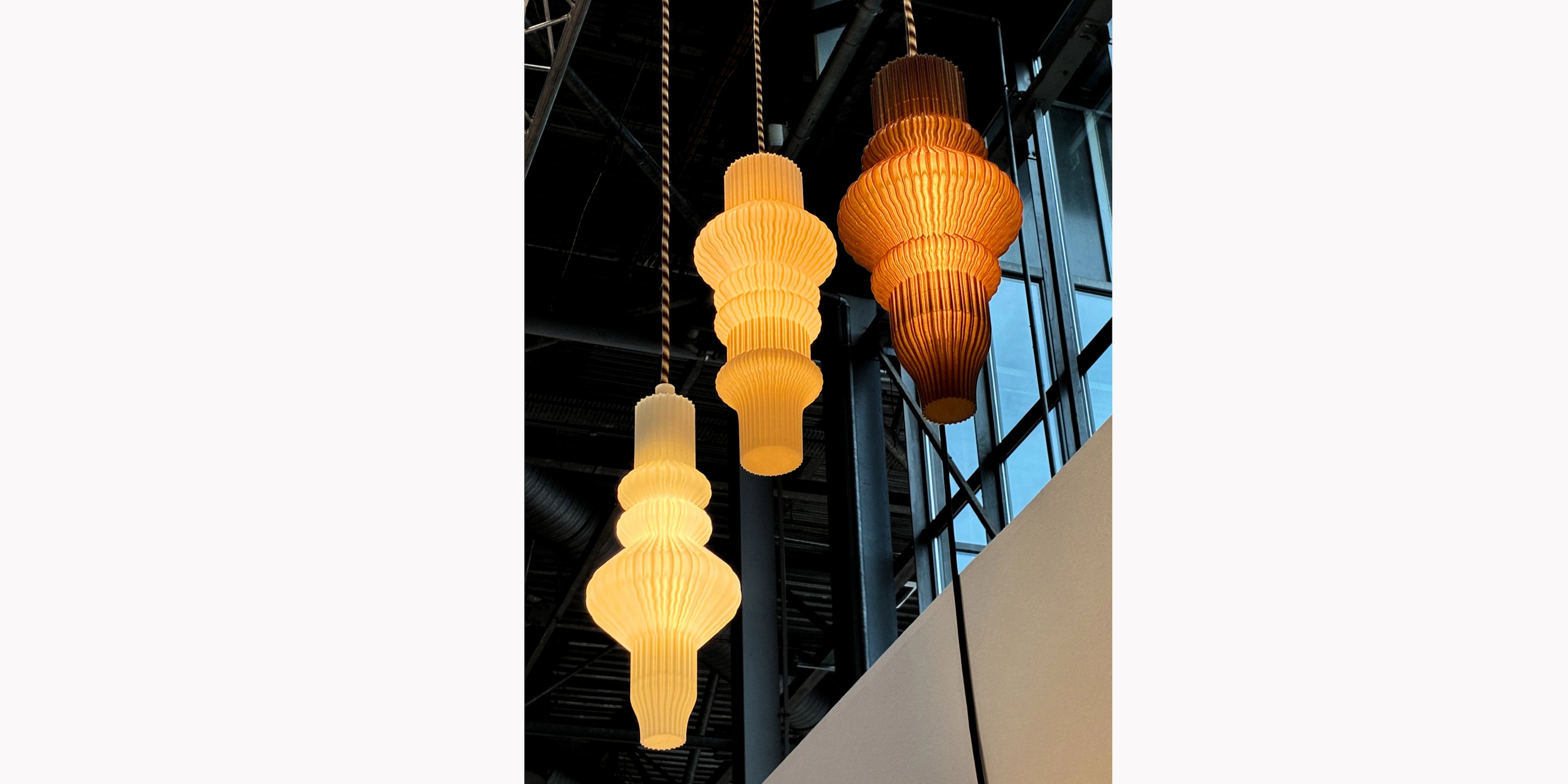 Nous dessinons alors 3 suspensions de tailles différentes aux formes tournées et texturées de stries légèrement ondulées pour casser l’aspect rigide de l’impression 3d : les suspensions Vira.